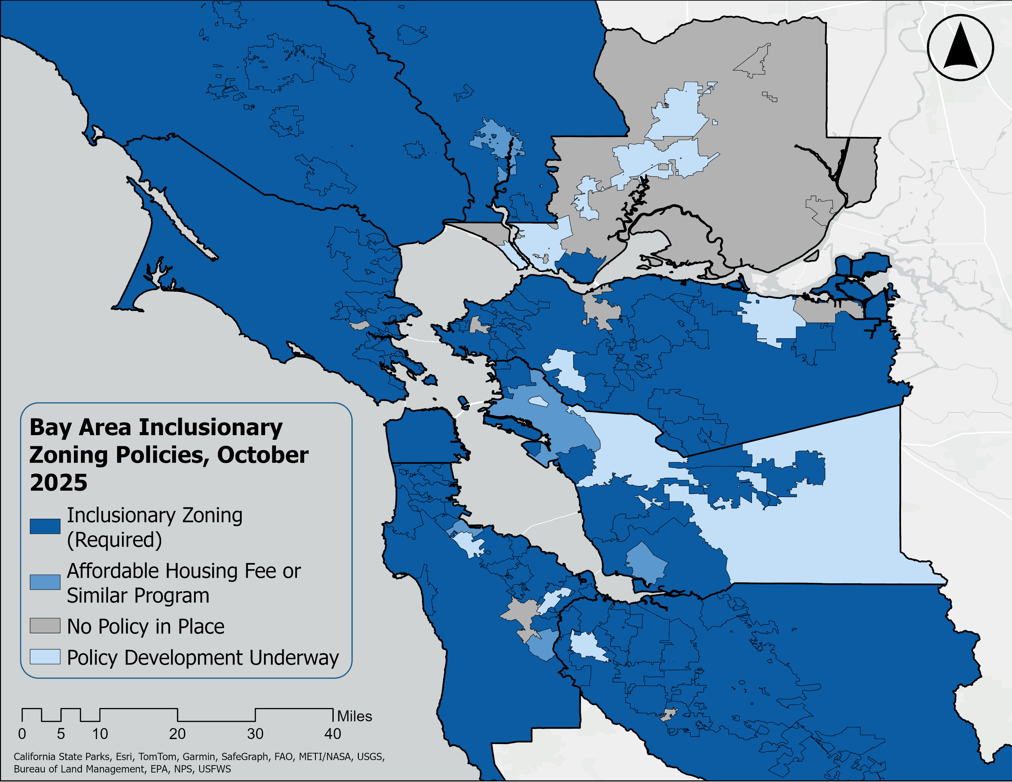 As of 2019, 162 California cities and counties have Inclusionary Zoning programs. In the Bay Area, specifically, 82 cities and counties (75 percent of jurisdictions) in the region have Inclusionary Zoning policies. All incorporated cities in Alameda County (with the exception of Piedmont, which is currently developing a policy) have either Inclusionary Zoning or a related program in place. The cities of San Leandro and Hayward have had Inclusionary Zoning programs since 2004, and the cities of Pleasanton and Livermore since 2000.